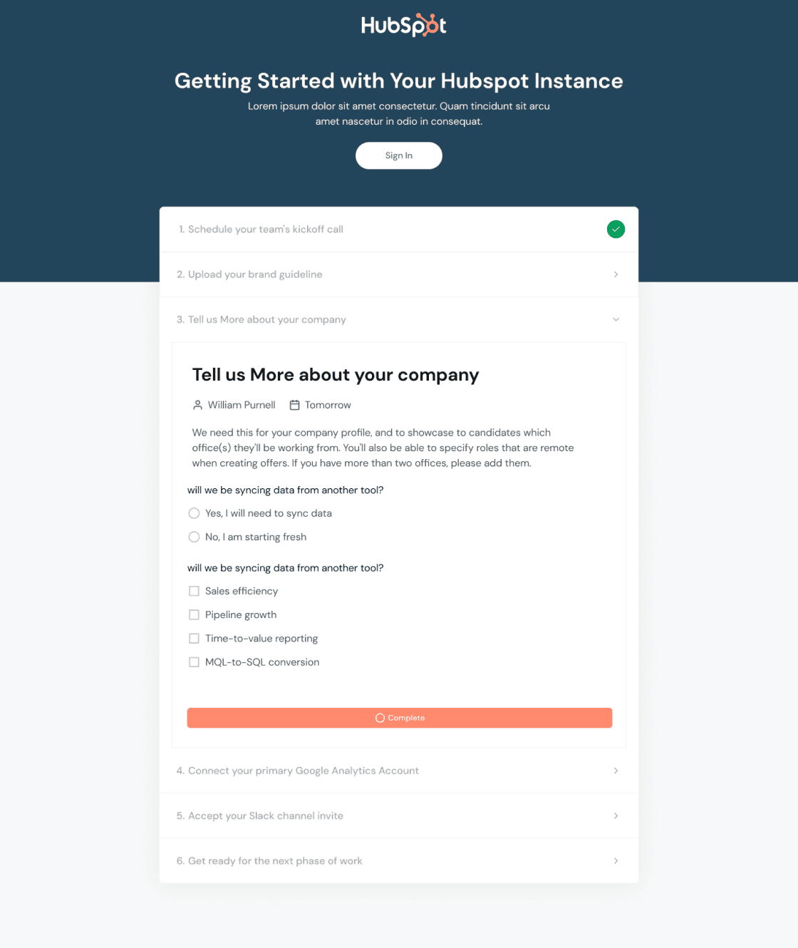 Create a custom-branded, sequenced onboarding journey for each customer segment. Your customer gets a single link and works through it on their own time — scheduling meetings, completing intake forms, watching videos, and learning your product, all without you in the room.